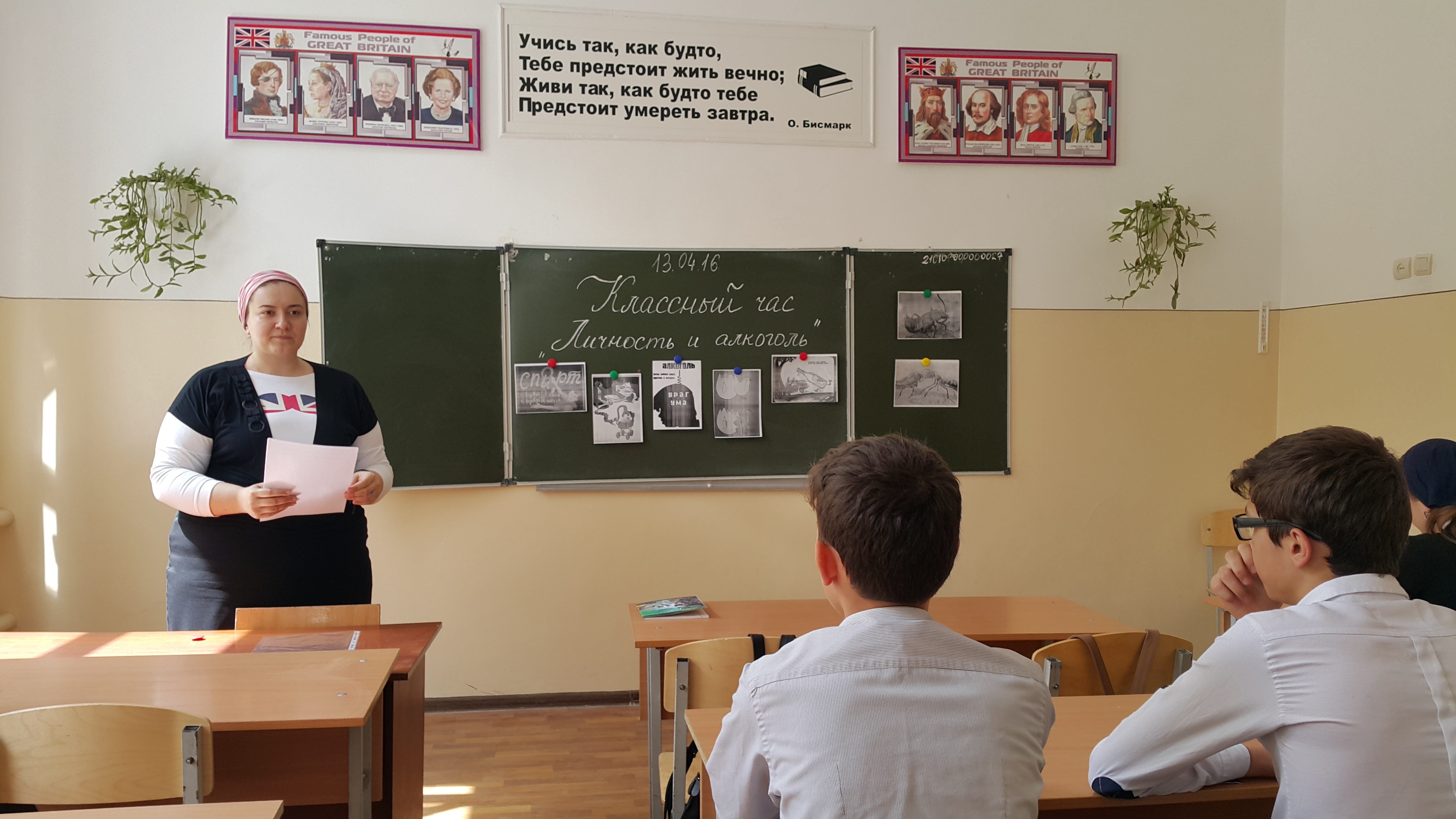 13.04.201613 апреля 2016 года для учащихся 8 класса МБОУ «СОШ ст. Горячеисточненская» был проведен классный час «Личность и алкоголь».