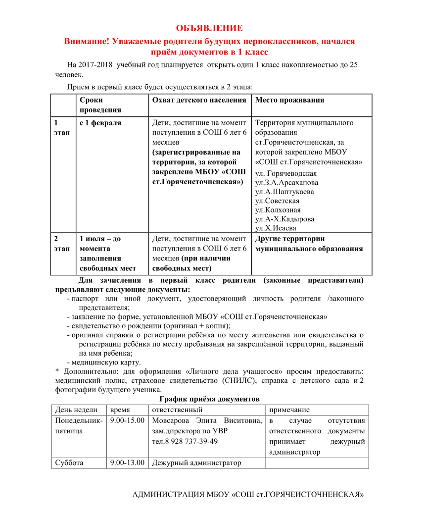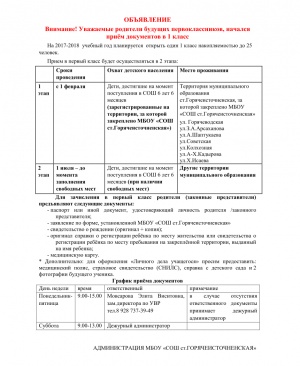 ОБЪЯВЛЕНИЕ Внимание! Уважаемые родители будущих первоклассников, начался приём документов в 1 класс