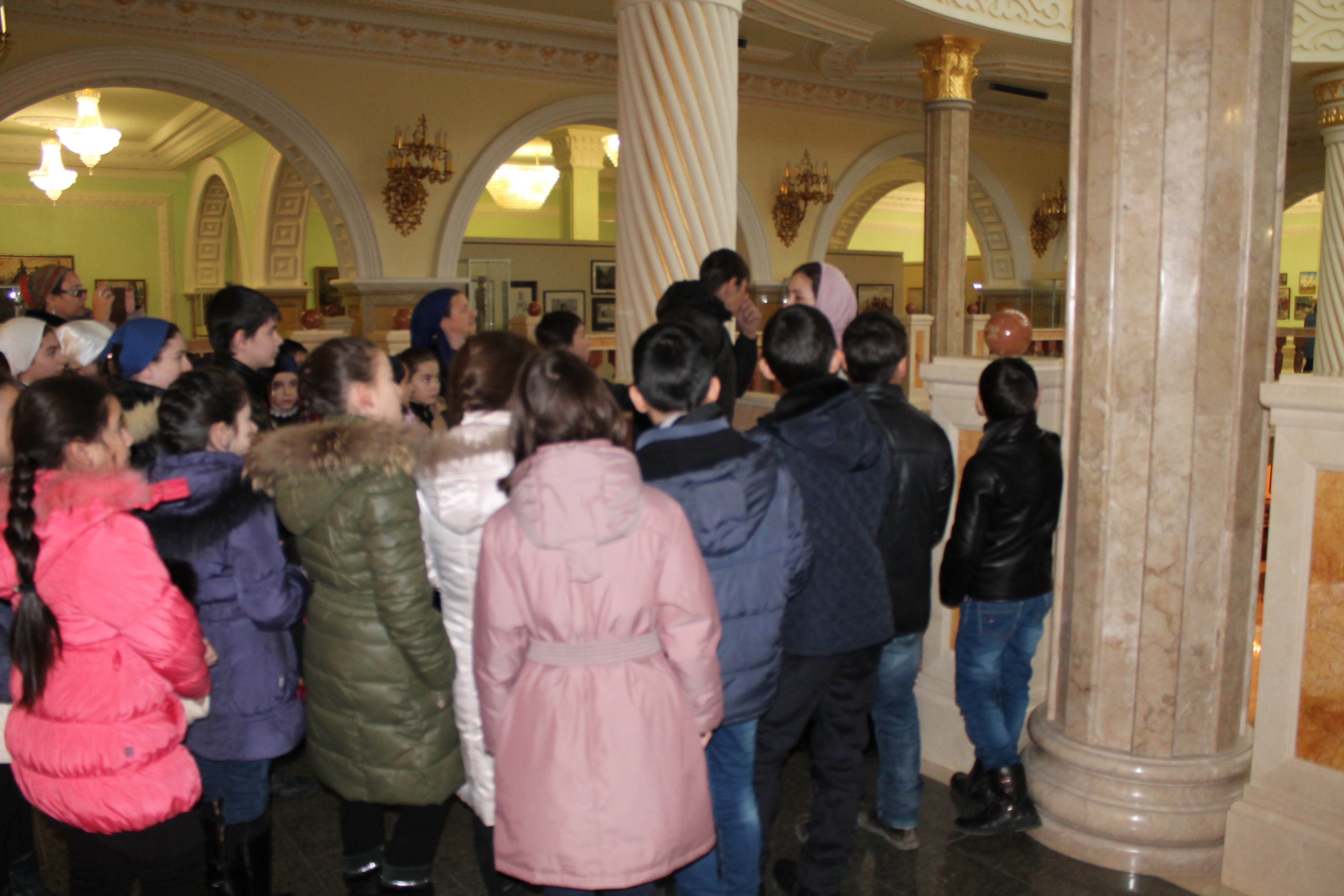 Посещение начали с «Аллеи Славы». Перед входом был проведен последний инструктаж. Гиды рассказали о подвигах, совершенных солдатами – чеченцами во времена Великой Отечественной войны, а в частности о героизме, который был проявлен ими при обороне Брестской крепости.В музее им. А.Х. Кадырова сильное впечатление на детей произвело его внутренне оформление, а в частности великолепная люстра, покрытая золотом высочайшей пробы с огромным количеством лампочек. На люстре выгравировано известное выражение Ахмата-Хаджи «Пусть восторжествует справедливость!». По словам экскурсоводов, сама люстра была привезена из Ирана и, по сути, она вместе со всем внутренним убранством музея является отдельным экспонатом.На одном из этажей музея находится художественная галерея, в которой представлены работы известных художников, среди которых имеются и местные авторы. На нижнем этаже представлена экспозиция посвященная Ахмат-Хаджи Кадырову, воспроизведен его рабочий кабинет, представлены предметы одежды и быта, семейные фотографии.Посмотрев и оценив все это великолепие, ученица 3а класса Хасиева Иман захотела оставить свой отзыв в книге пожеланий. Представленные экспонаты и картины очень впечатлили наших учащихся. Обстановка и сам интерьер не оставили равнодушными никого.