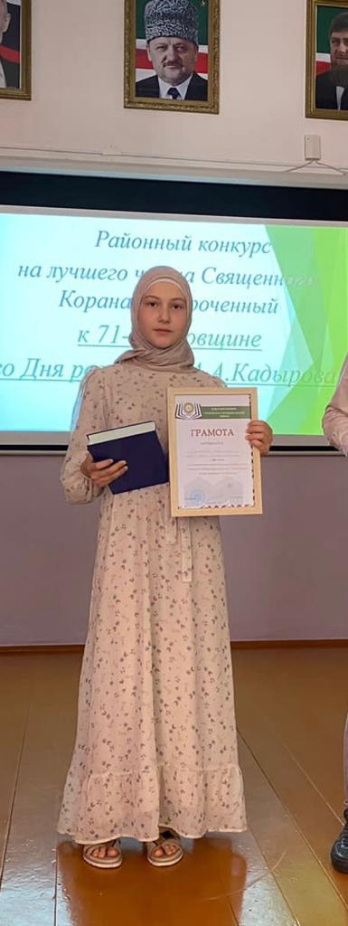 Нукаева Петимат, ученица 8 класса МБОУ «СОШ ст.Горячеисточненская», заняла 3-е место в районном конкурсе на лучшего чтеца Священного Корана, приуроченному к 71-й годовщине со Дня рождения А.А.Кадырова.