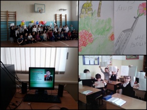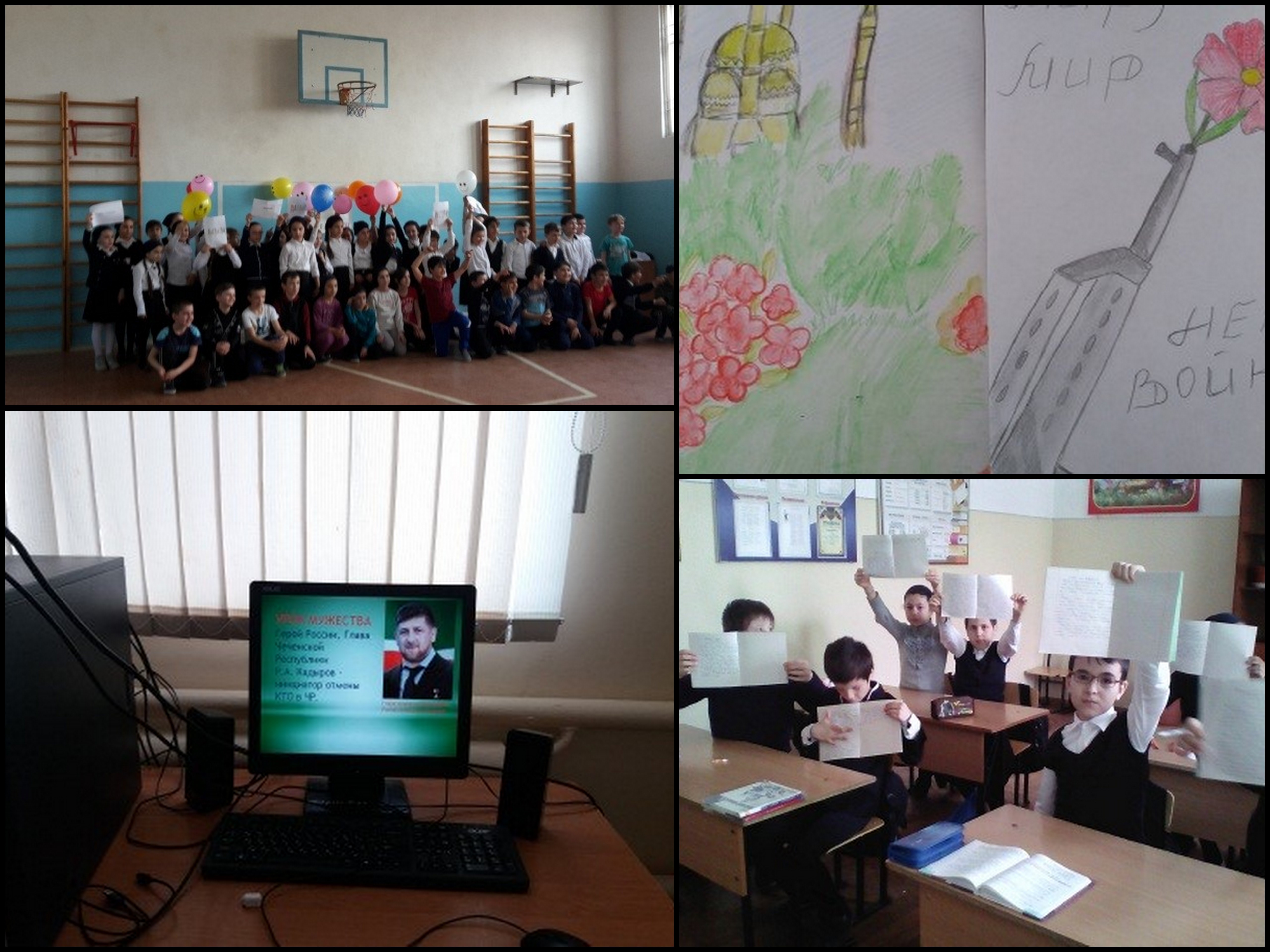 В 1-8 классах классные руководители провели классные часы «День мира в Чеченской Республике». В 9-11 классах прошли Уроки Мужества, посвященные Дню отмены режима КТО в нашей Республике. Цели проведения урока: - показать необходимость защищать мир - формировать активную жизненную позицию
