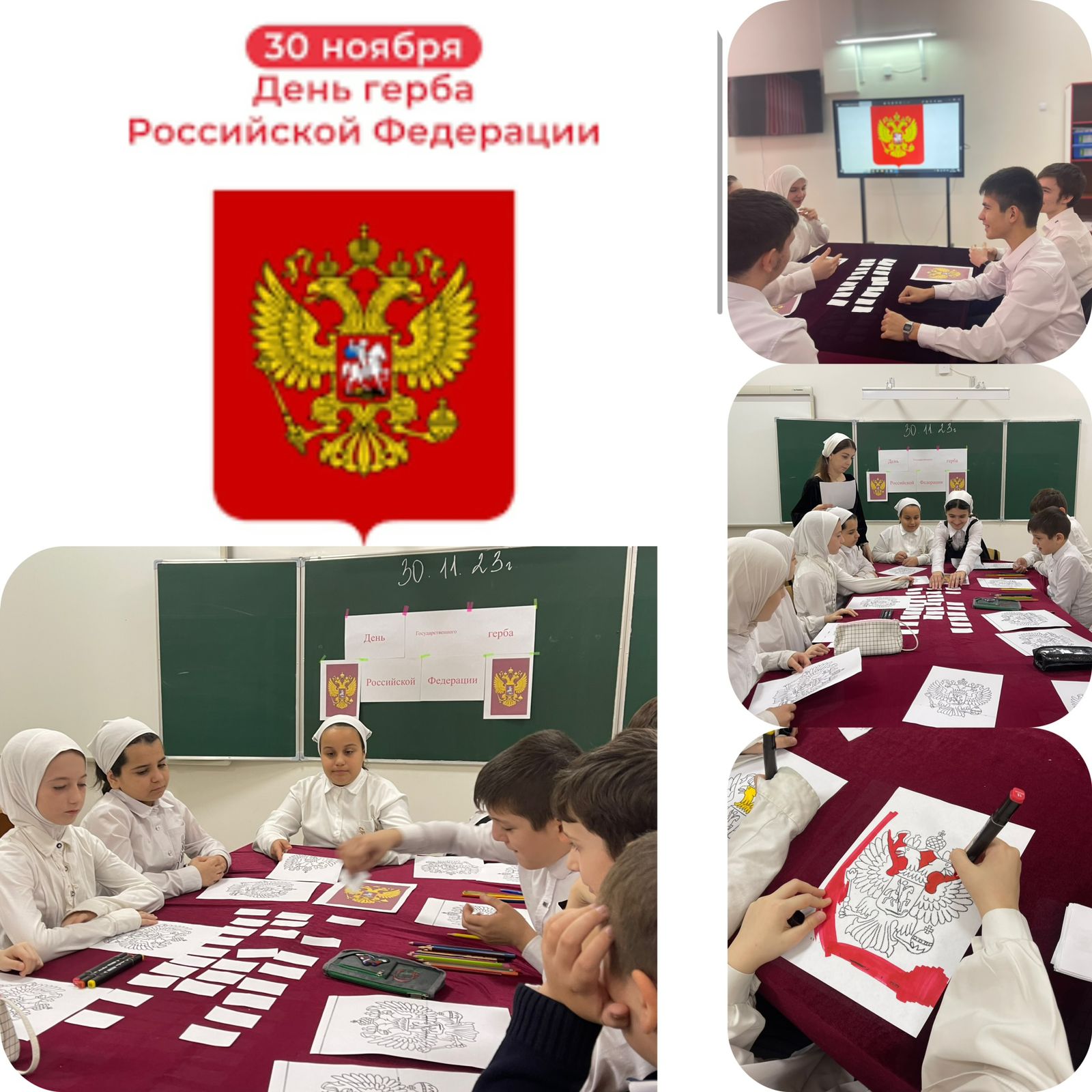 Советник директора по воспитанию и взаимодействию с детскими общественными объединениями Шаипова З.Ш. провела ряд мероприятий, приуроченных к данному событию. Учащиеся приняли участие в коллективно-творческом деле "Наш герб". Также были проведены игра «Герб отечества» и настольная игра «История Российского герба». В ходе мероприятий учащиеся познакомились с геральдикой, с историей российского герба и нарисовали герб.