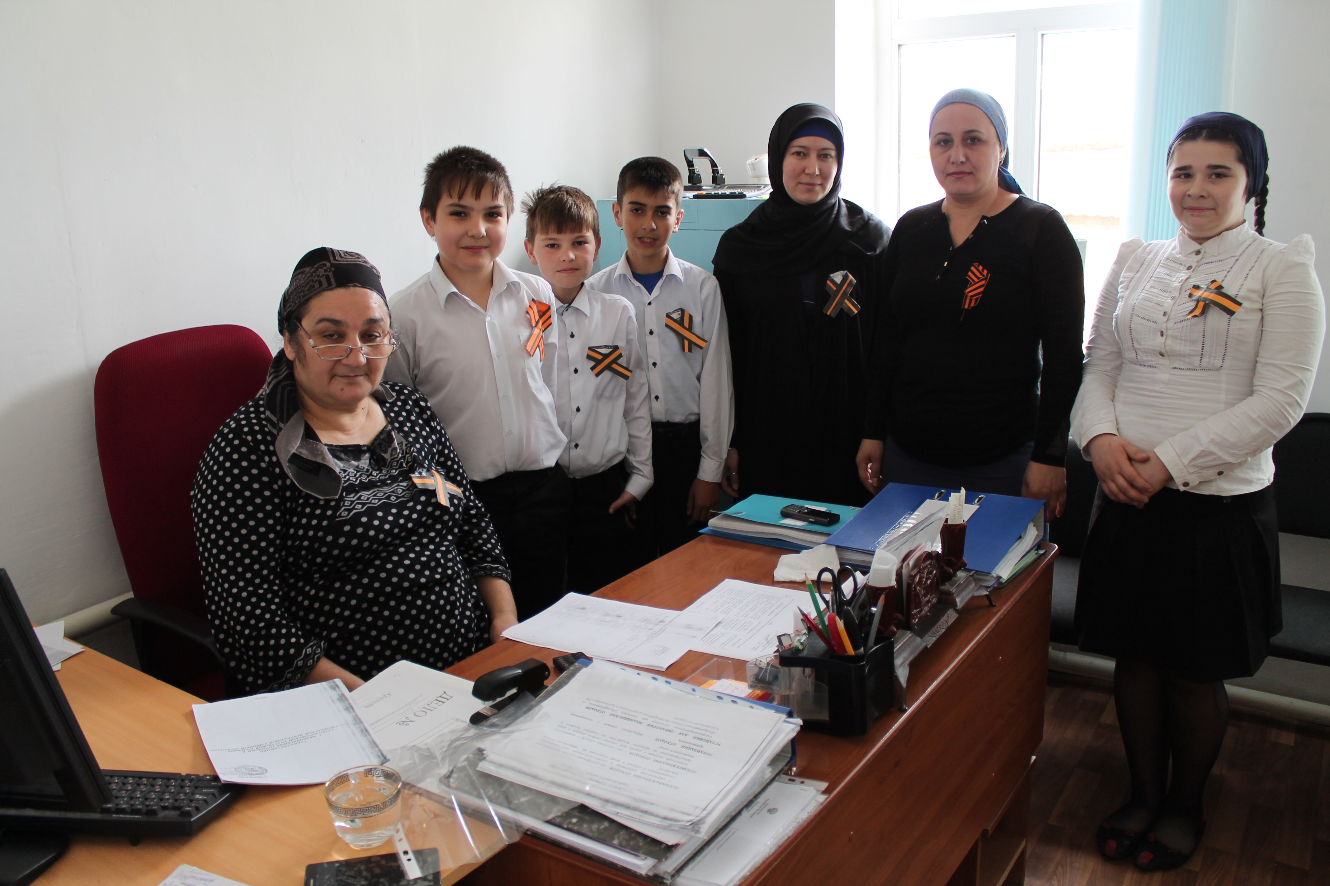 Обучающиеся раздали Георгиевские ленточки в больнице, в детском саду «Иман», в частной школе, среди населения.Их задача: 1.Привлечение внимания жителей Чеченской Республики к празднованию 70-й годовщины Победы в Великой Отечественной войне;2. Выражение уважения и благодарности ветеранам-фронтовикам, воспитание в молодом поколении чувства гордости за Родину.
