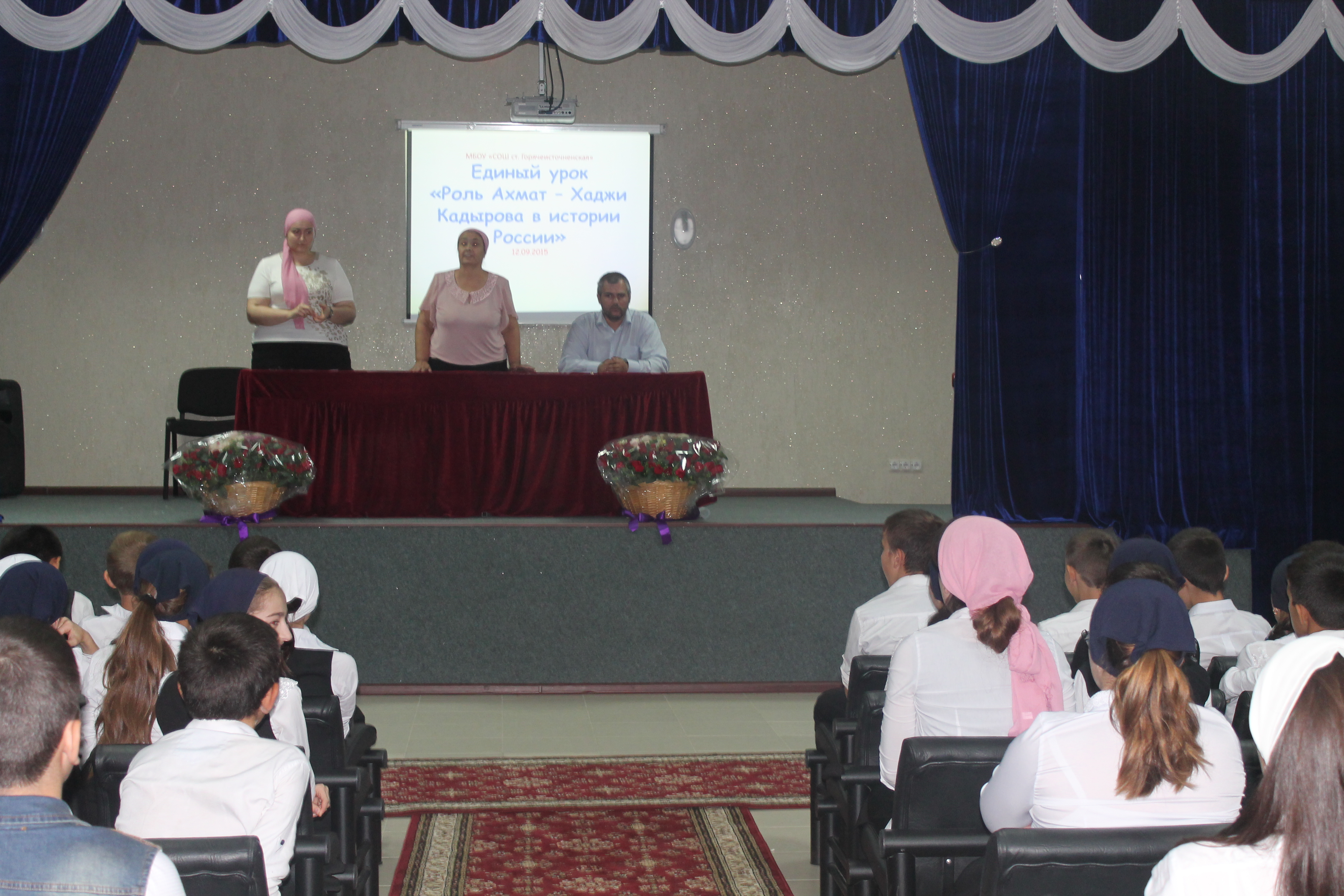 Открыла Единый урок зам. директора школы Ахмедова З.А. В своём выступлении она отметила тему урока. Также она сказала, что это Единый урок по всей Республике, в нём примут участие более 60 тысяч обучающихся нашей республики. А-Х Кадыров - великий государственный деятель и каждый молодой человек должен знать и рассказывать о его роли в укреплении целостности России. Далее выступила учитель истории Ахмедова Э.Ю. со вступительным словом к обучающимся школы. Она отметила, что, начатое первым Президентом ЧР А-Х. Кадыровым, был завершен уже нынешним Главой Республики Рамзаном Кадыровым. Чеченская Республика сегодня является одним из стабильных и динамично развивающихся регионов Северного Кавказа. Всем жителям Чечни известно, что всё это было бы невозможно без титанических усилий Ахмат-Хаджи Кадырова. В истории нашего народа было множество героев, но личностью, которая смогла объединить наш народ, стал А-Х. Кадыров, положивший свою жизнь на алтарь мира на чеченской земле, - подчеркнула она. Новый курс диктовал не войну до победного конца, а национальное и религиозное примирение, установление согласия и развитие толерантного сознания у политически и духовно разобщенного народа.